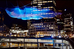 Unnumbered Sparks is an interactive art collaboration between artist Janet Echelman and Google creative director Aaron Koblin for TED 2014. The art installation and experience is made from ultralight fibers and hangs from a skyscraper over the water and walkways near the Vancouver Convention Center. According to a blog post by Google Creative Lab’s Jenny Ramaswamy, the interactive lighting “is actually one giant Chrome window, stretched across the 300-foot long sculpture with the help of five high-definition projectors…the result is a crowd-controlled visual experiment on a giant, floating canvas.”
